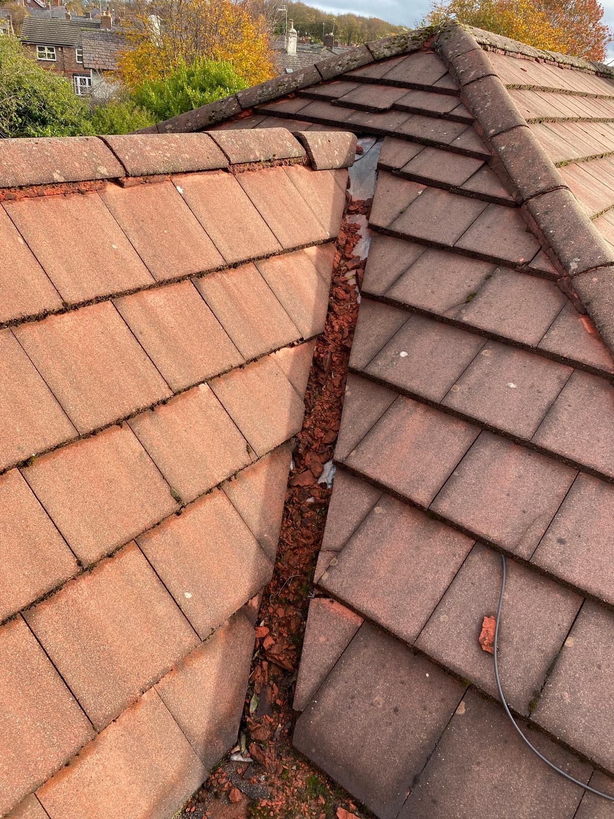 Cracked tiles from falling ridge tiles or chimney bricks